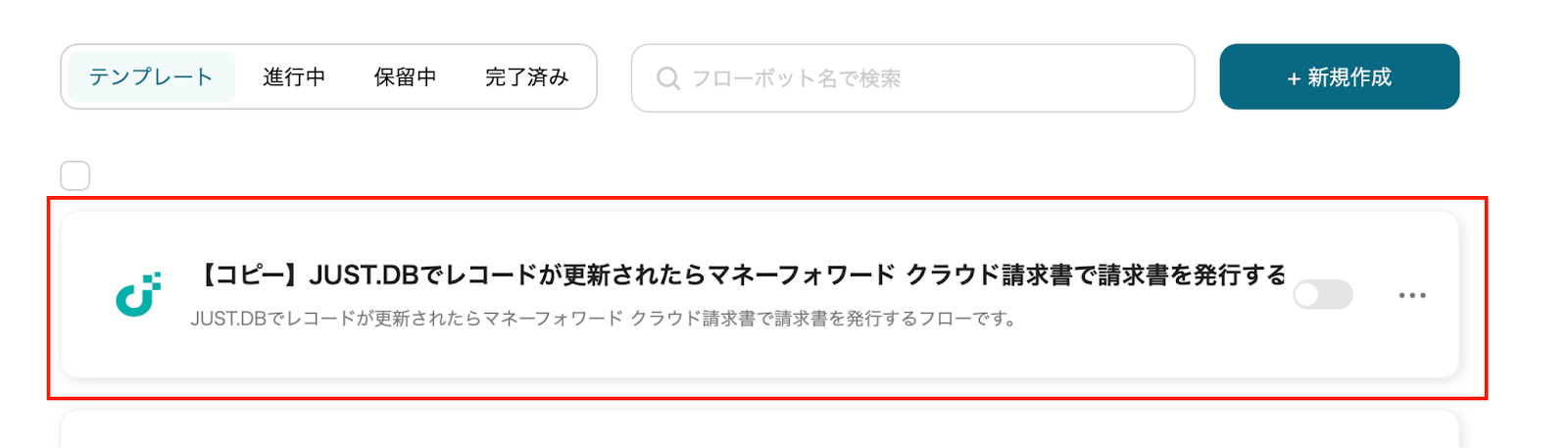 では、「JUST.DBでレコードが更新されたらマネーフォワード クラウド請求書で請求書を発行する」のテンプレートを使ったフローボットを作成していきましょう。