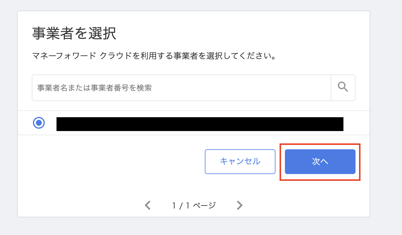 マネーフォワード クラウドを利用する事業者を選択し、[次へ]をクリックします。