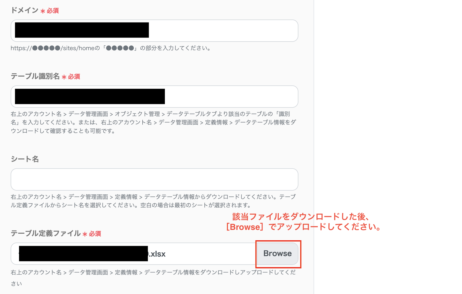 (8)「テーブル定義ファイル」はJUST.DB側で該当するデータファイルをダウンロードし、アップロードしてください。