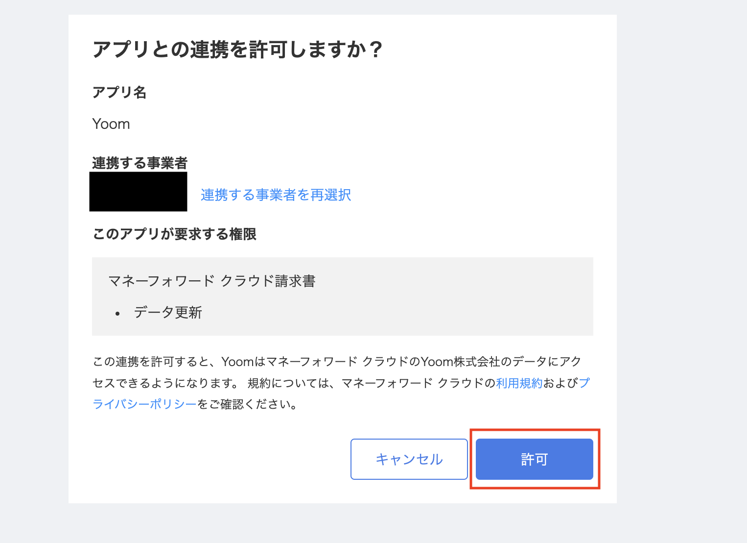 クリックした後、Yoomとの連携を許可するかの画面が表示されます。
