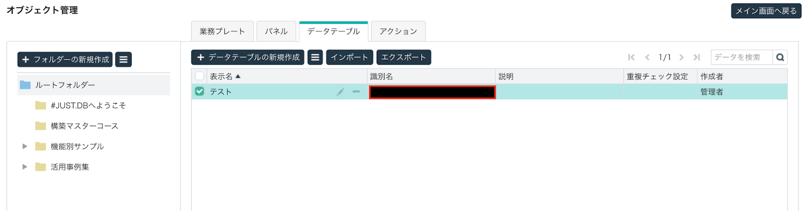 「テーブル識別名」は、以下の画面のようにJUST.DBのオブジェクト管理画面で確認できます。