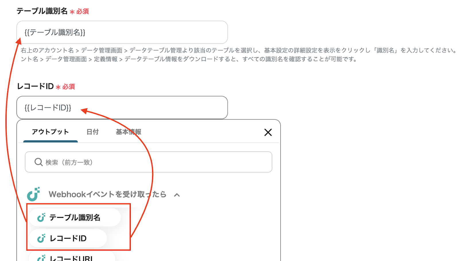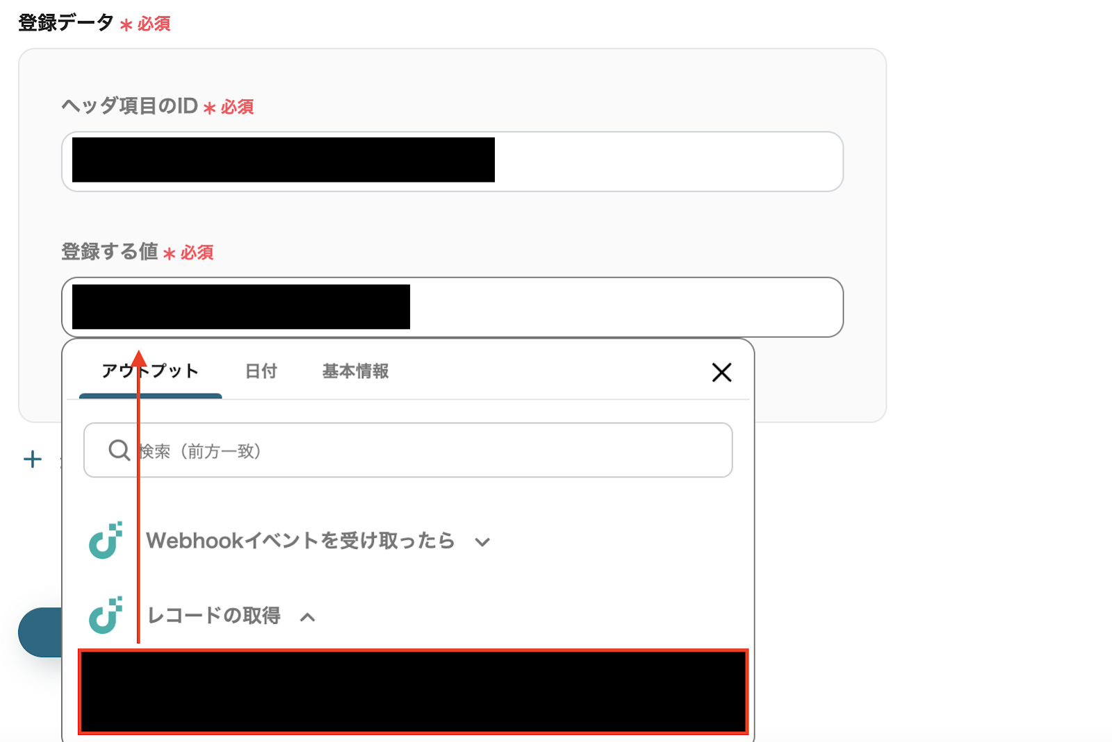 (5)『登録データ』の項目では、以下の画像のように入力バーをクリックすると、前ステップから取得したアウトプットを引用できます。
