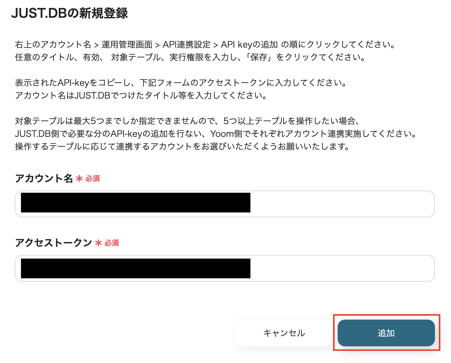 (3)連携するJUST.DBの「アカウント名」と「アクセストークン」を入力し、[追加]をクリックします。