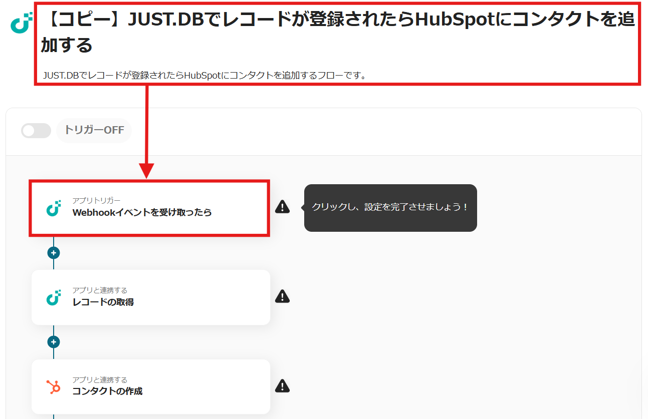 1.HubSpotのフォームの回答内容を自動的にJUST.DBに登録するフローです。