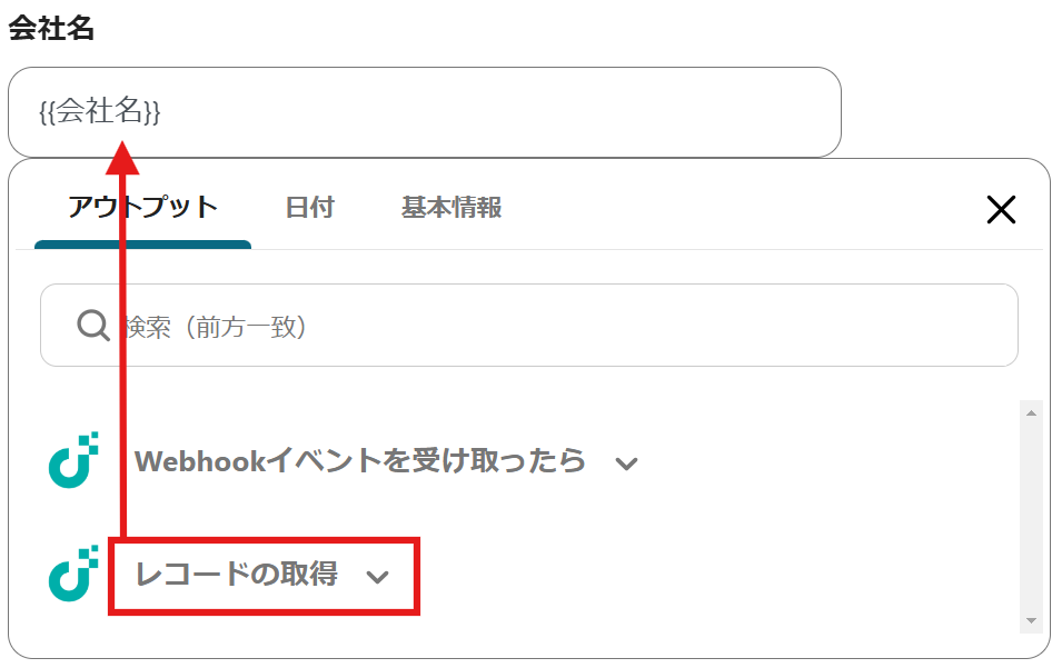 「レコードの取得」のアウトプットを活用して、項目名に合うアウトプットを選択してください。