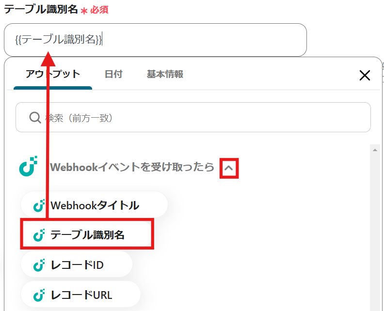 「Webhookイベントを受け取ったら」のアウトプットを使用して、以下のようにテーブル識別名を選択します。
