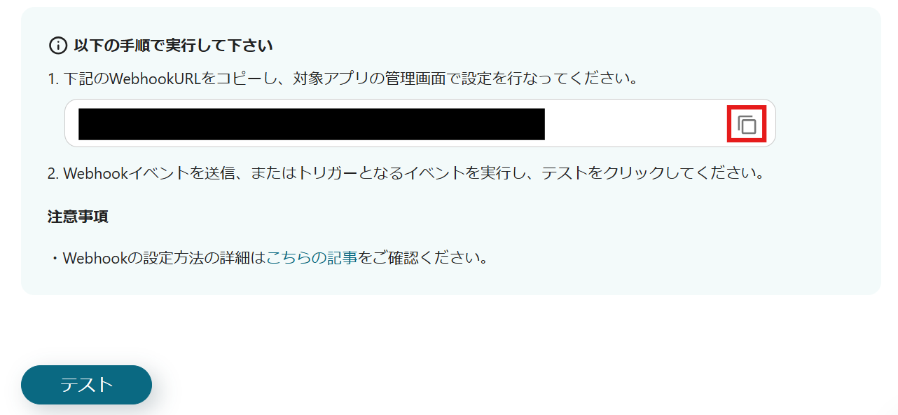 以下の画面が表示されたら、赤枠内をクリックしてWebhook URLをコピーします。