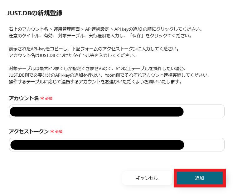 「追加」をクリックすると、JUST.DBのマイアプリ登録は完了です。