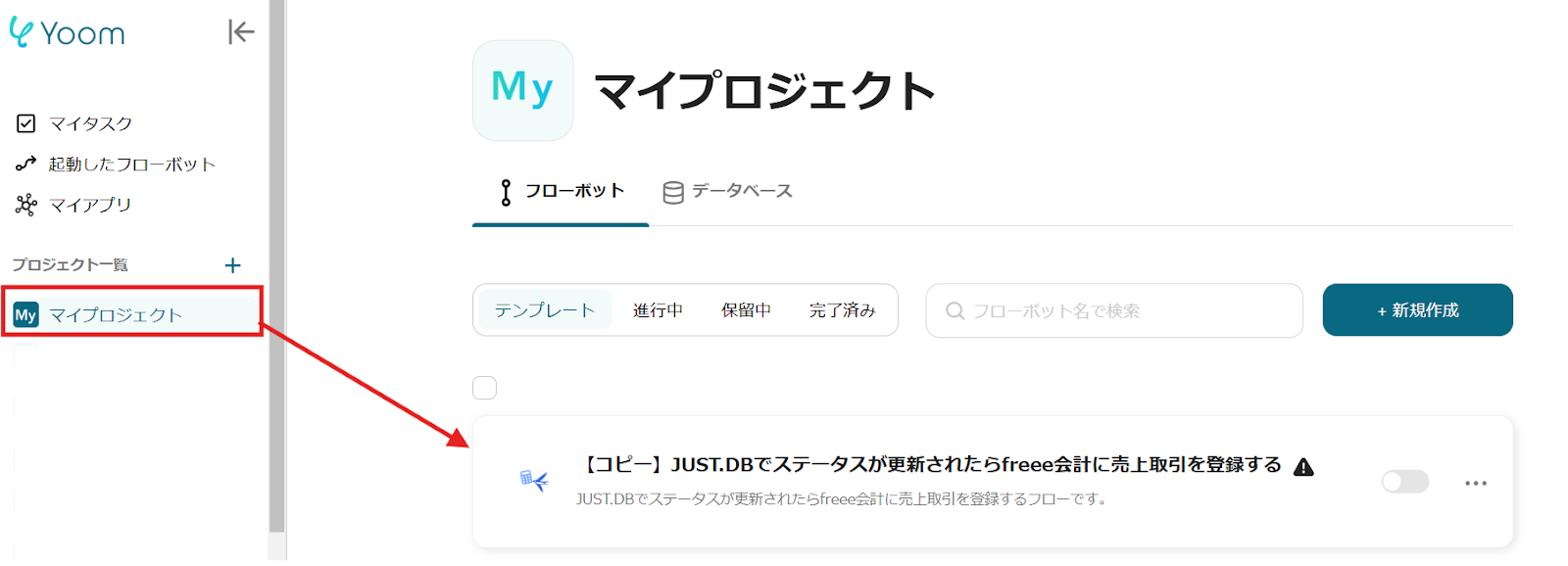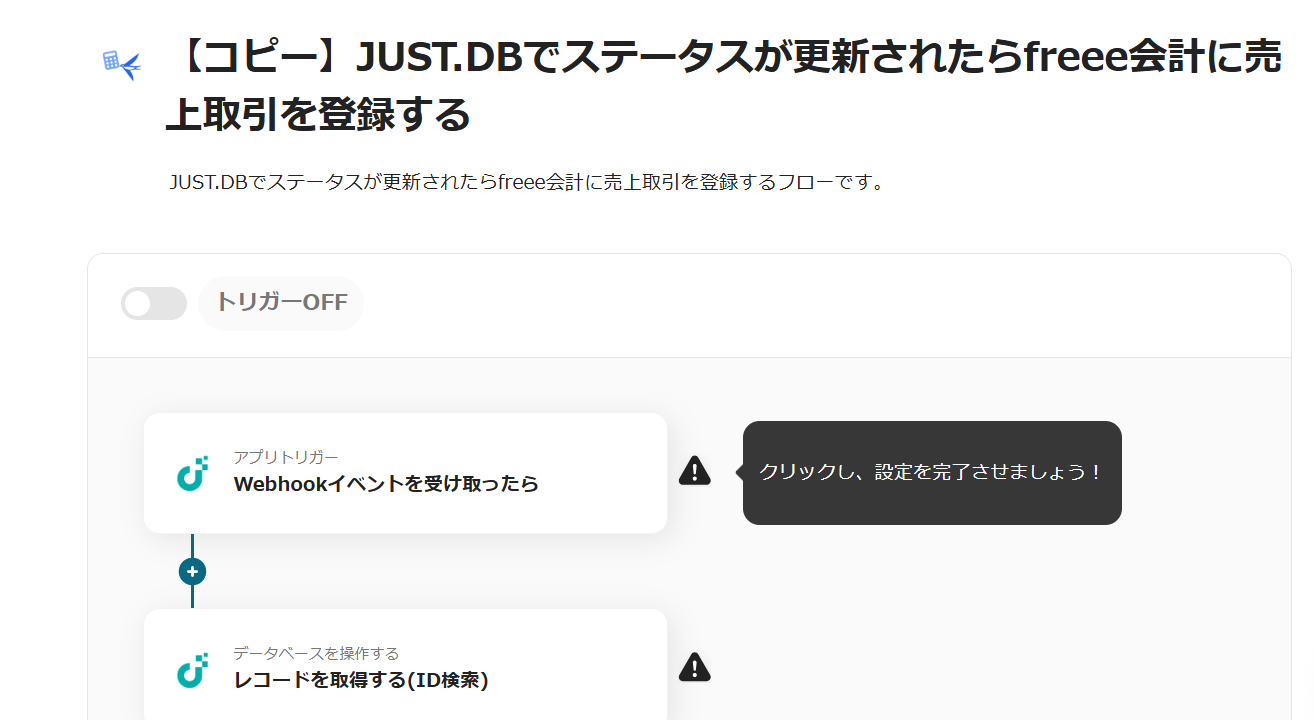 ここからは、Yoomのテンプレート【JUST.DBとfreee会計を連携して、JUST.DBでステータスが更新されたらfreee会計に売上取引を登録する方法】という連携フローを使って設定の解説をします。