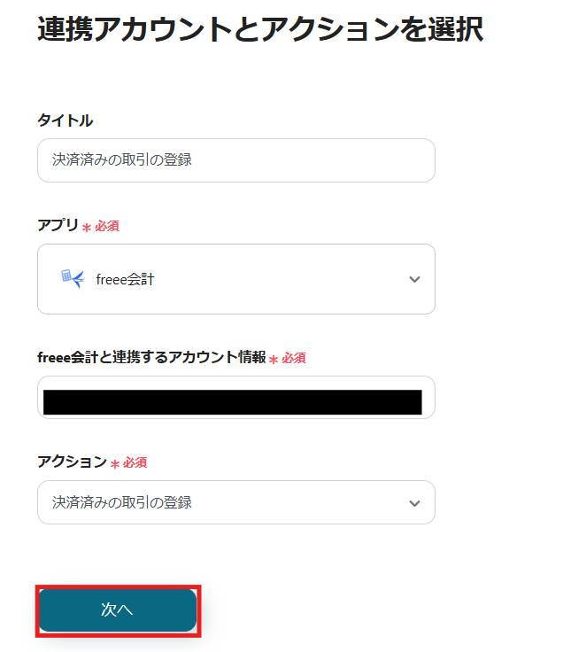 2) アクションは「決済済みの取引の登録」を選択し、「次へ」をクリックします。