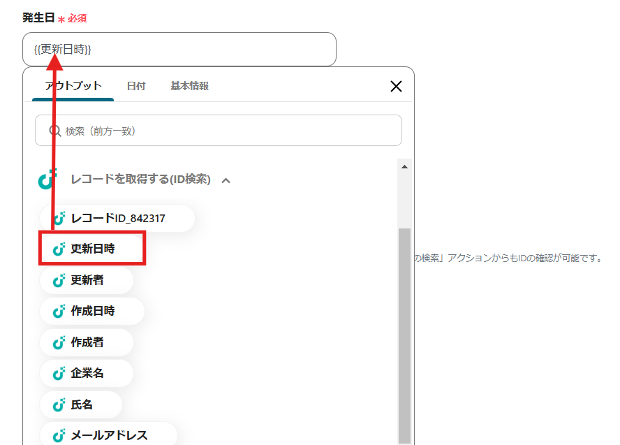 レコードのID 等しい {{レコードのID}}となるように候補から選択します。