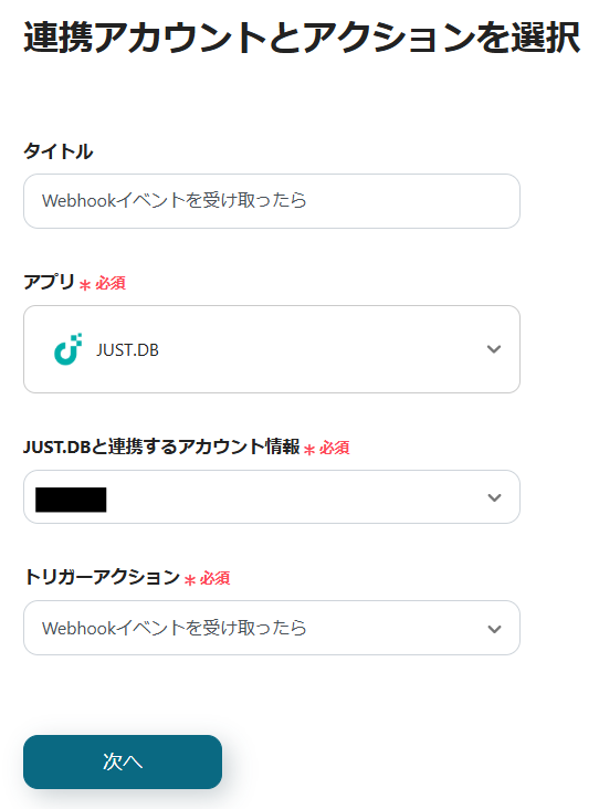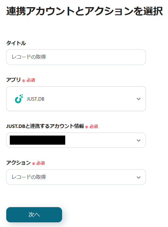 3.JUST.DBと連携するアカウントを確認し、「次へ」をクリックします。