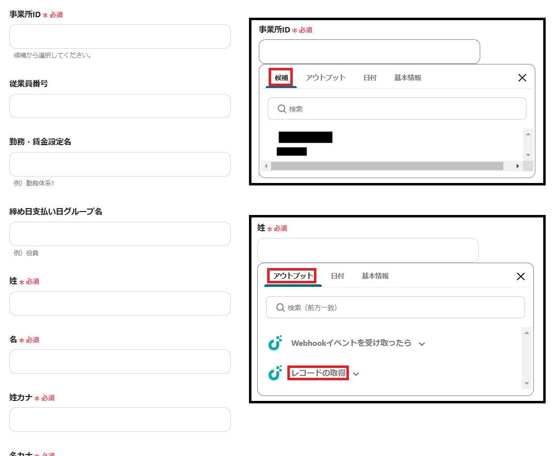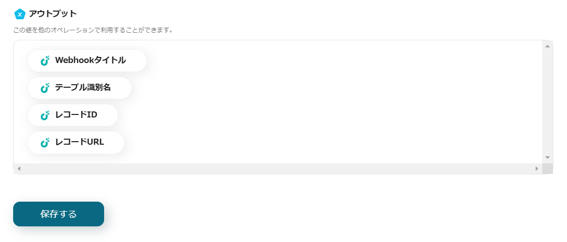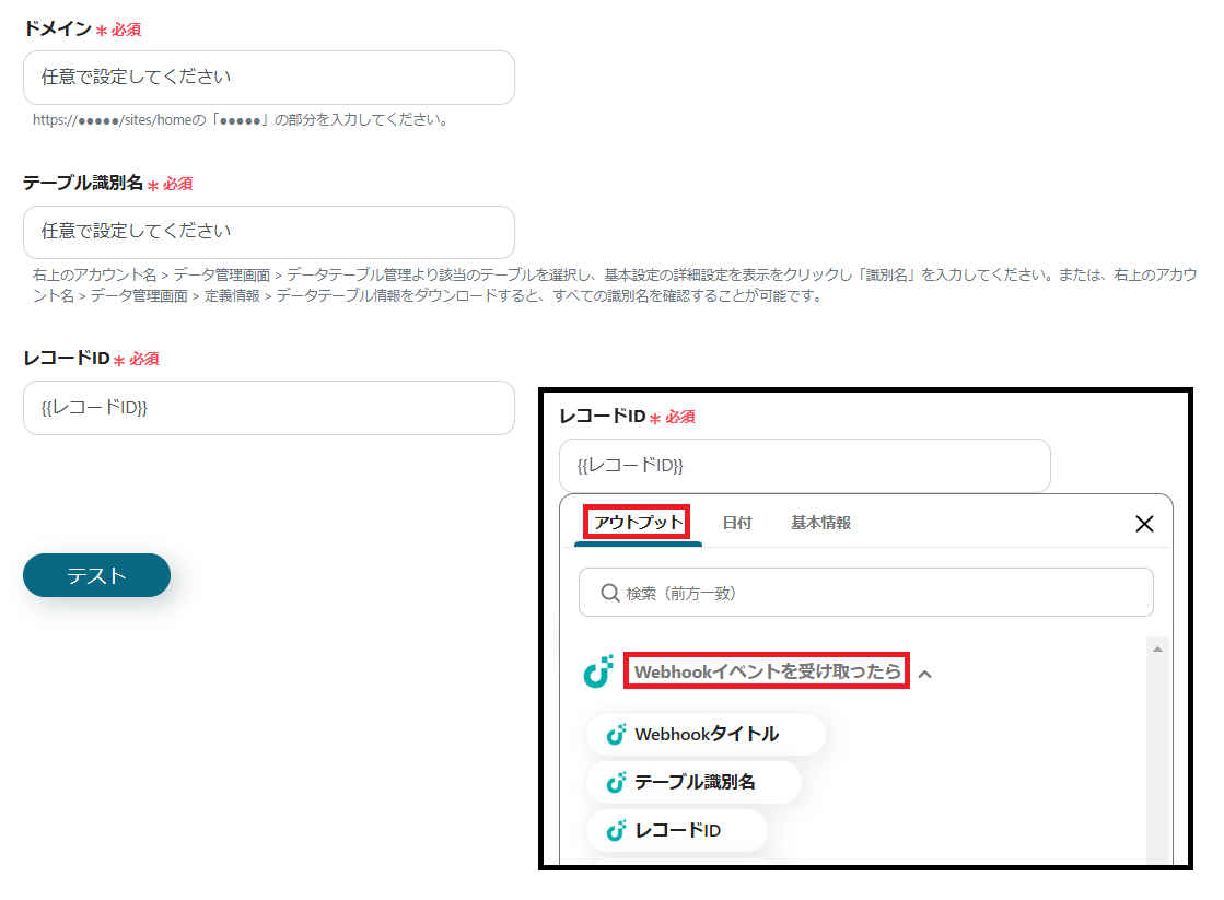 ※レコードIDは、枠をクリックして表示されるアウトプットの「Webhookイベントを受け取ったら」から設定します。(値は二重括弧で表示されます)