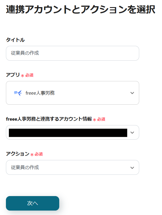 2.freee人事労務と連携するアカウントを確認し、「次へ」をクリックします。