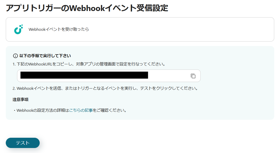 4.WebhookURLをコピーし、JUST.DBに設定したらテストを行います。