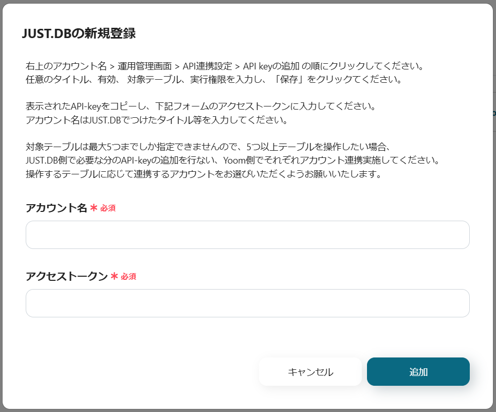 ・アカウント名とアクセストークンを入力し、「追加」をクリックすると、マイアプリに登録が完了します。