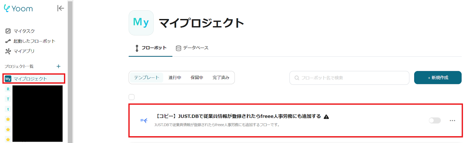 1.Yoom管理画面の「マイプロジェクト」を選択し、「【コピー】JUST.DBで従業員情報が登録されたらfreee人事労務にも追加する」をクリックします。