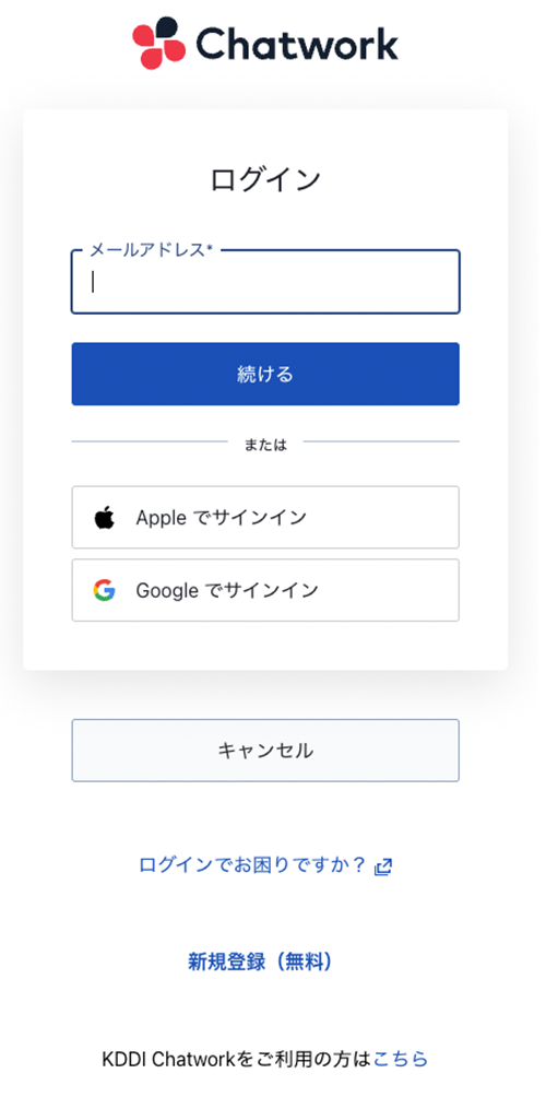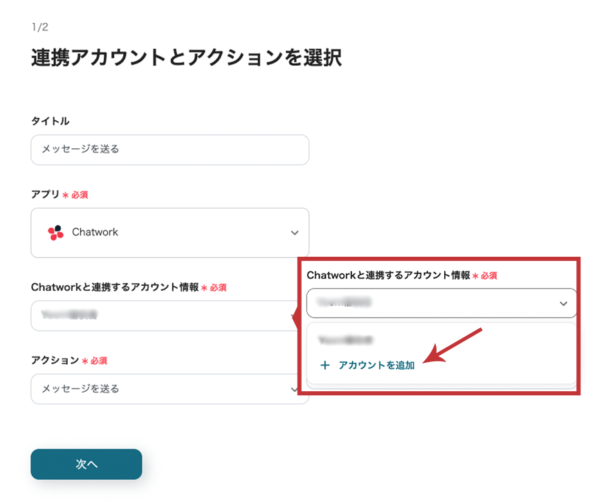 Chatworkと連携するアカウント情報:「+連携アカウントを追加」をクリック。Chatworkにログインする画面に遷移します。