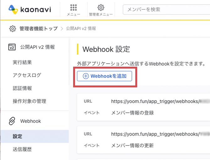 管理者機能トップ →公開API v2 情報 →左側のWebhook直下の設定をクリック →Webhook設定の「+Webhookを追加」をクリックします。