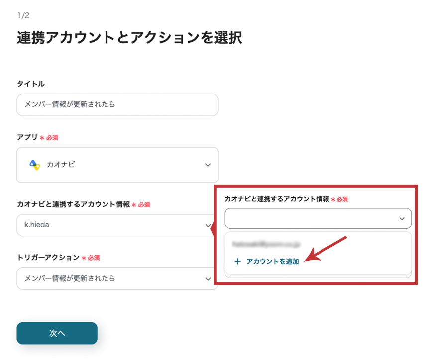 カオナビと連携するアカウント情報は設定が必要です。私の場合はすでに連携済みの表示なんですが、初めての連携ではアカウント情報のプルダウンに表示される+アカウントを追加をクリック!