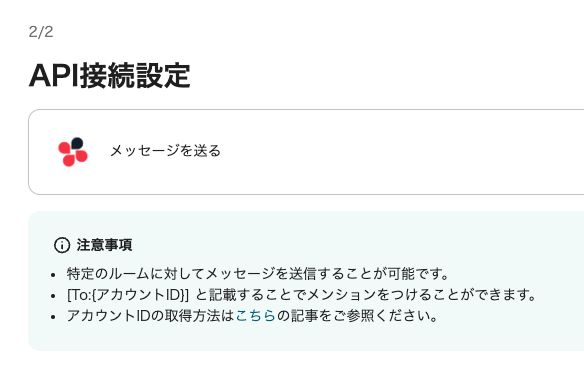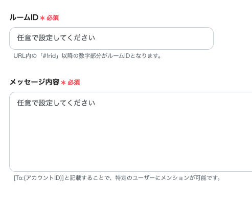 ・Chatworkのオペレーションで、連携アカウントや通知先のトークルーム、メッセージ内容の設定を行ってください。
