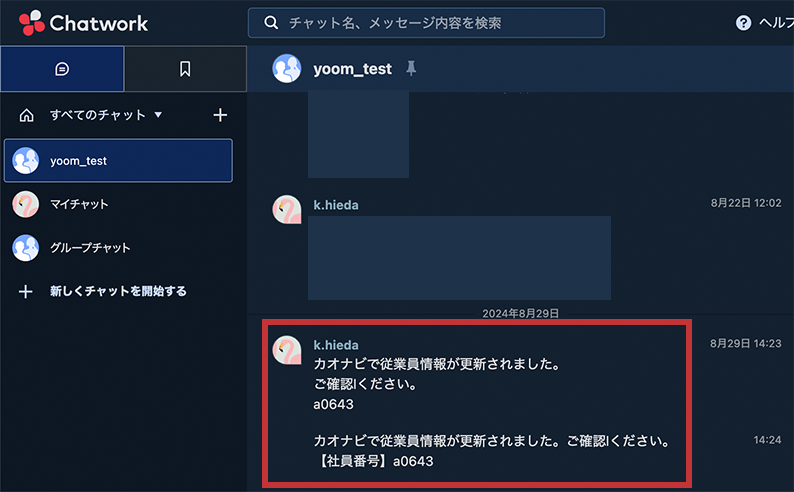 このテンプレートは、カオナビで従業員の更新があれば自動的にChatworkに通知を出すことができます。