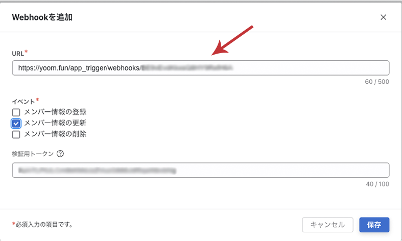 イベントに「メンバー情報の更新」にチェックを入れて保存ボタンを押下します。※検証用トークンは自動で文字列が生成されている状態です。
