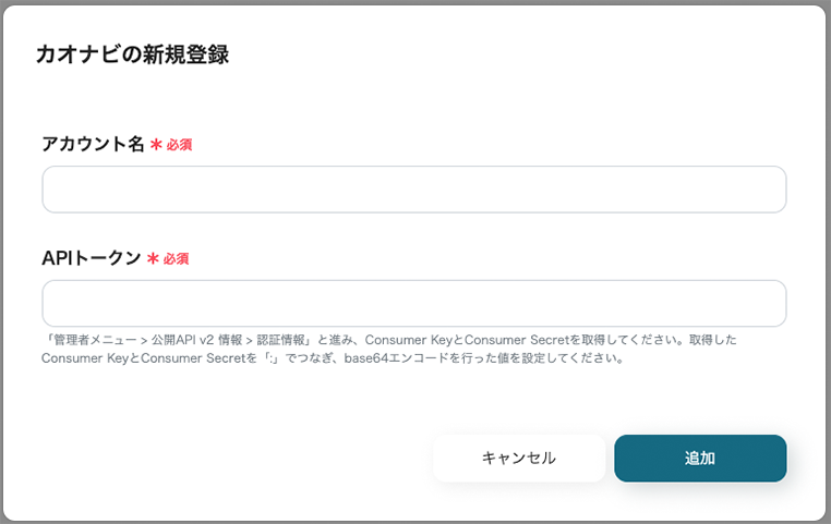 以下の画面が表示されるので、「アカウント名」と「APIアクセストークン」を入力し、「追加」をクリックします。