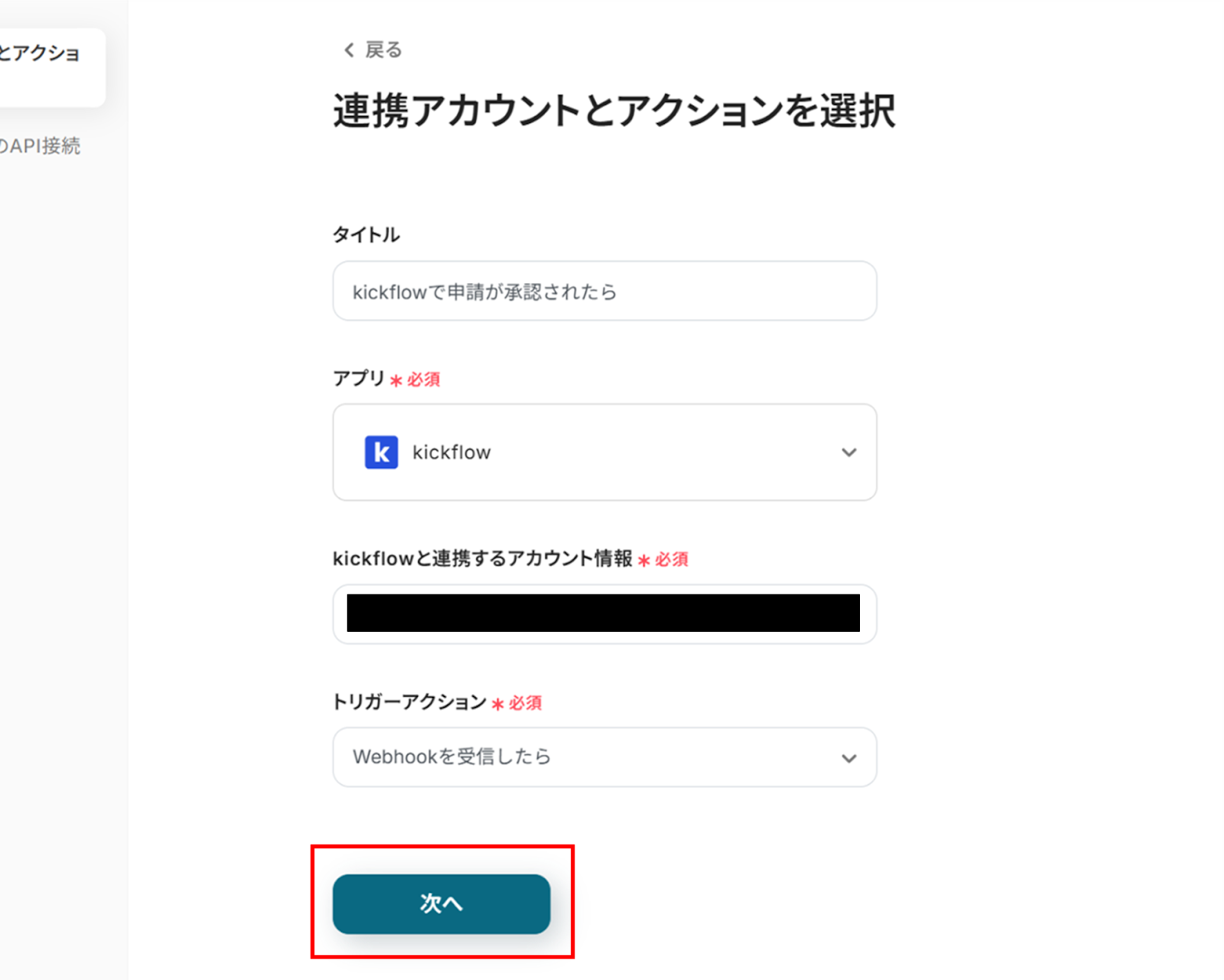 (2)kickflowの「連携アカウントとアクションを選択」画面から、kickflowと連携するアカウント情報に誤りがないかを確認し、トリガーアクションは「kickflowで申請が承認されたら」のままで「次へ」をクリックします。