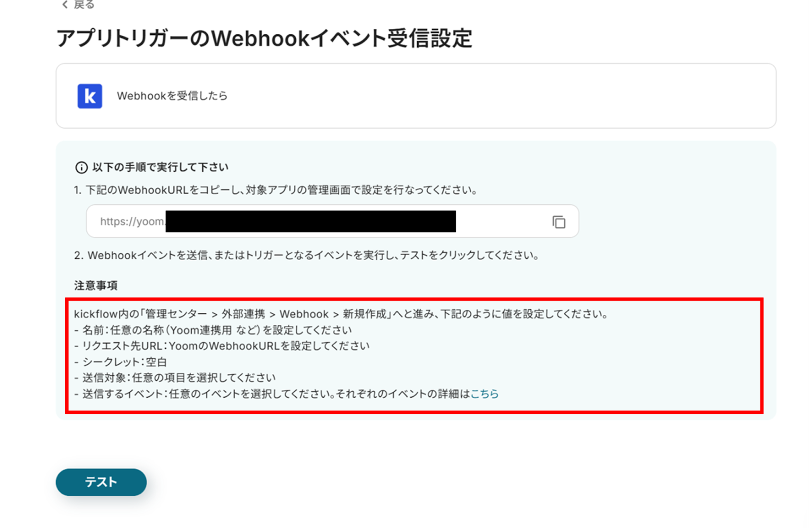 (3)「アプリトリガーのWebhookイベント受信設定」画面から赤枠を確認の上、WebhookURLをコピーし、kickflowの管理画面で設定を行ってください。