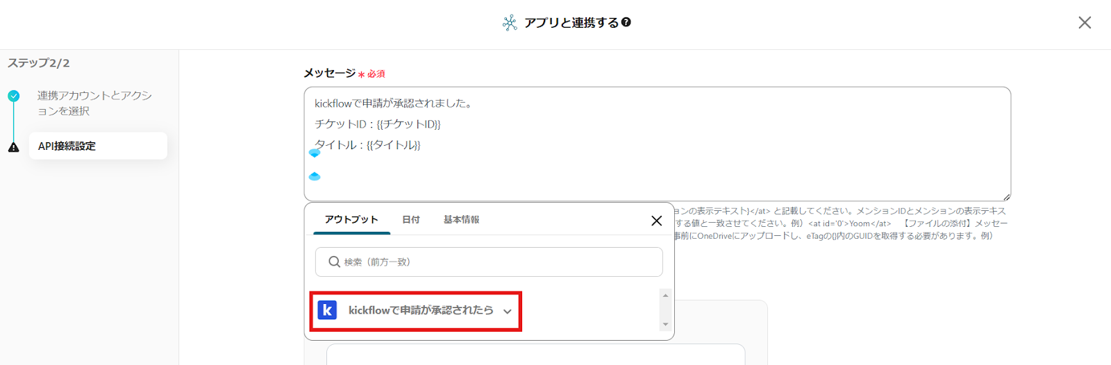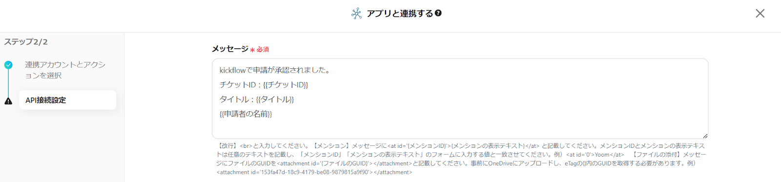 赤枠の捕捉に沿って、kickflowから設定を行ってください。その後、テスト用の申請を行い、承認をします。