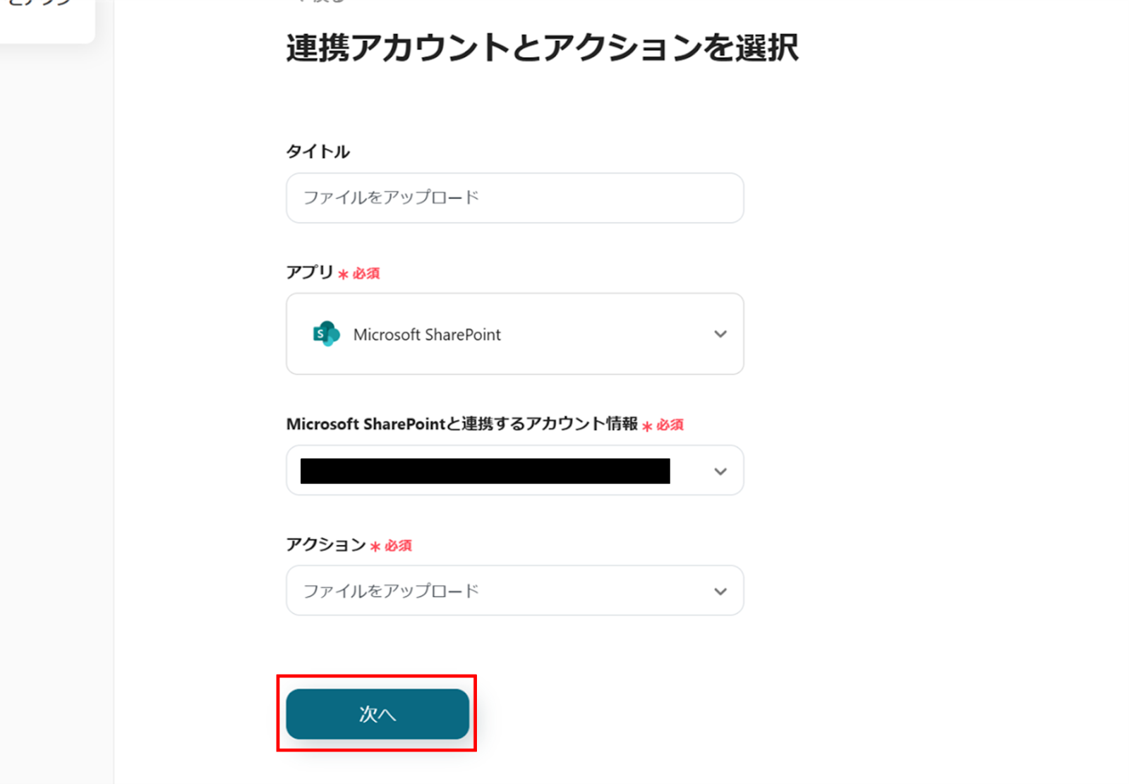 (2)Microsoft SharePointの「連携アカウントとアクションを選択」画面から、Microsoft SharePointと連携するアカウント情報に誤りがないかを確認し、アクションは「ファイルをアップロード」のままで「次へ」をクリックします。