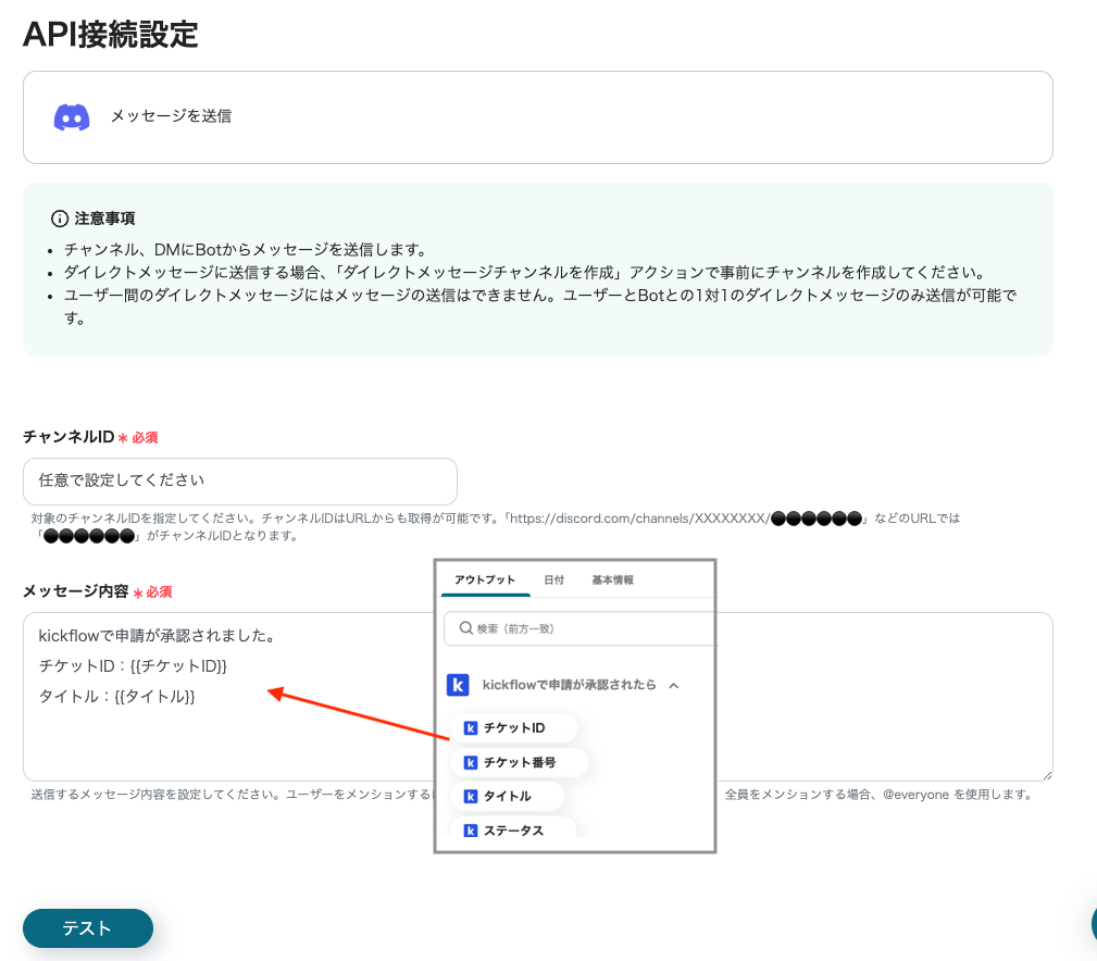 「メッセージ内容」は任意で編集できます。欄をクリックするとkickflowから取得した情報を引用できます。