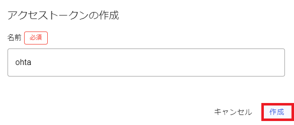 作成するアクセストークンに名前をつける必要があるのでネーミングを決めます。こちらも任意のネーミングでOKです!