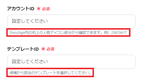 テンプレートIDはボックス内をクリックすると上記のように候補が表示されるので、今回のフローで使用するテンプレートをクリックしましょう!
