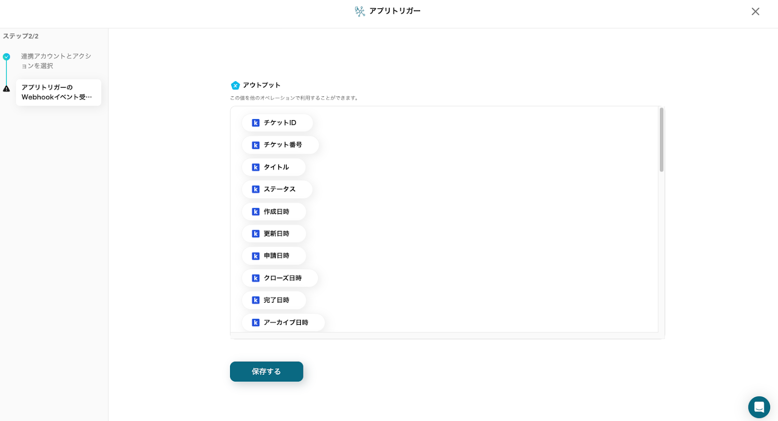 「チケットID」は入力欄をクリック後に表示された『取得した値』から【チケットID】を選択し、「テスト」をクリックしてください。
