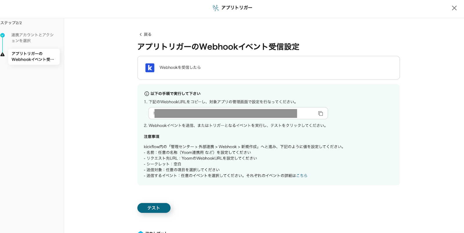 次に、注釈を参照し、表示されているWebhookURLをkickflowで設定を行なってください。
