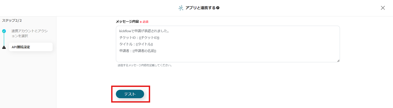 テスト用の申請を行い承認をしたら、赤枠のテストボタンを押してください。