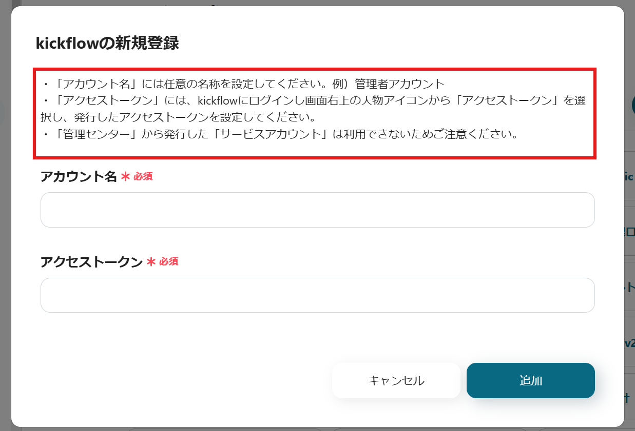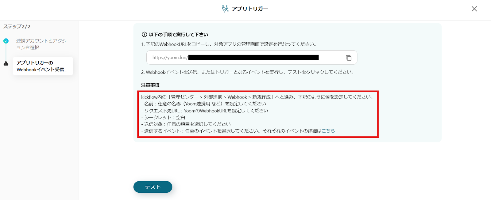 赤枠の捕捉に沿って、kickflowから設定を行ってください。その後、テスト用の申請を行い、承認をします。