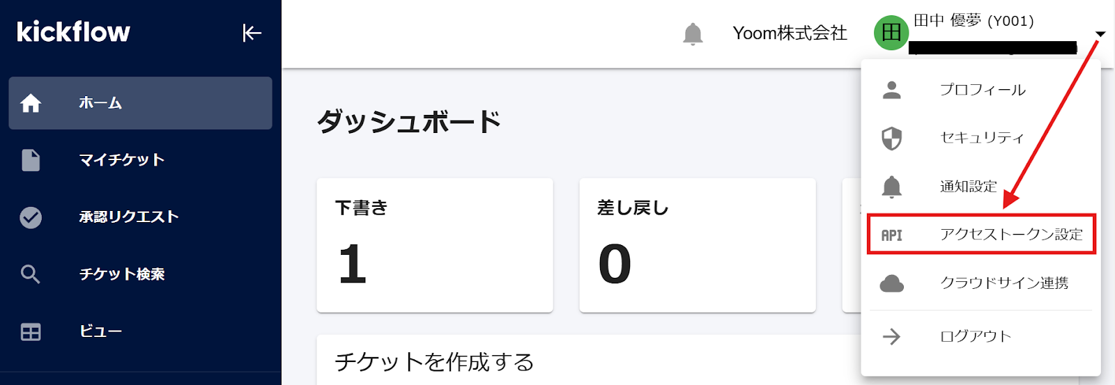 右上のアイコンをクリックし、アクセストークン設定を選択しましょう。