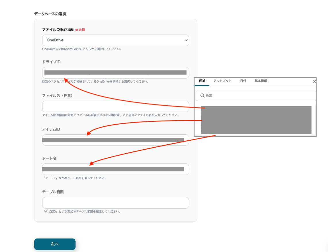 「ドライブID」「アイテムID」「シート名」を候補から選択し「次へ」をクリックしてください。