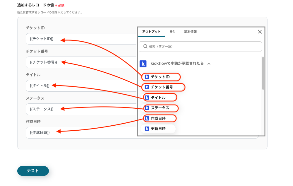 設定後、「テスト」をクリックして、Microsoft Excelにレコードが追加されるか確認しましょう。