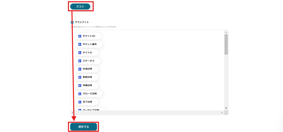 テストをクリックすると、kickflowから取得した情報がアウトプットに表示されます。