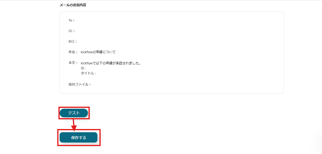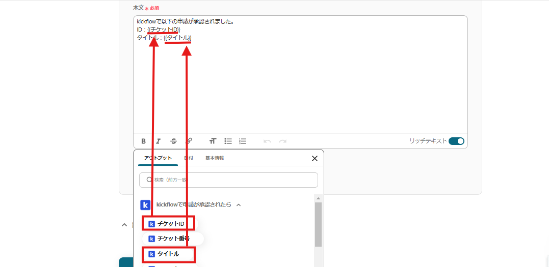 {{●●●}}の部分は、kickflowから取得した申請者のメールアドレスを自動で引用することができます。設定方法は以下の通りです。