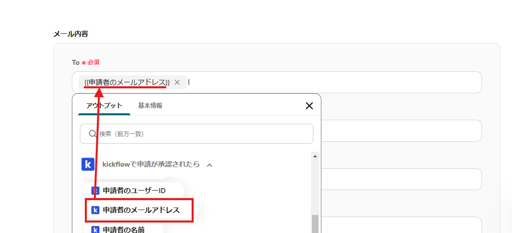 ファイル名を引用したい場合→枠内をクリックし「kickflowで申請が承認されたら」の中にある「申請者のメールアドレス」を選択します。