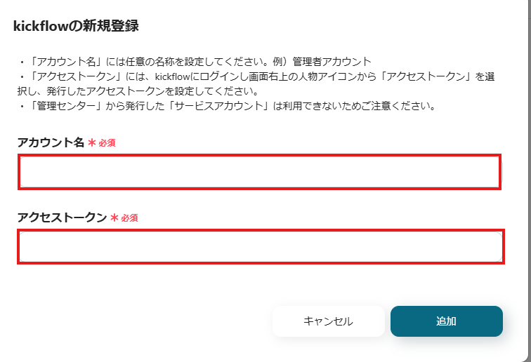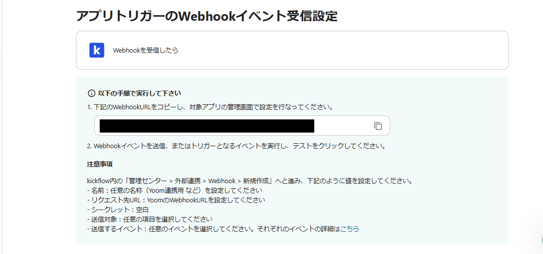 画面に表示されているWebhookURLをコピーし、注釈を参考にしながらkickflow内で設定を行ってください。