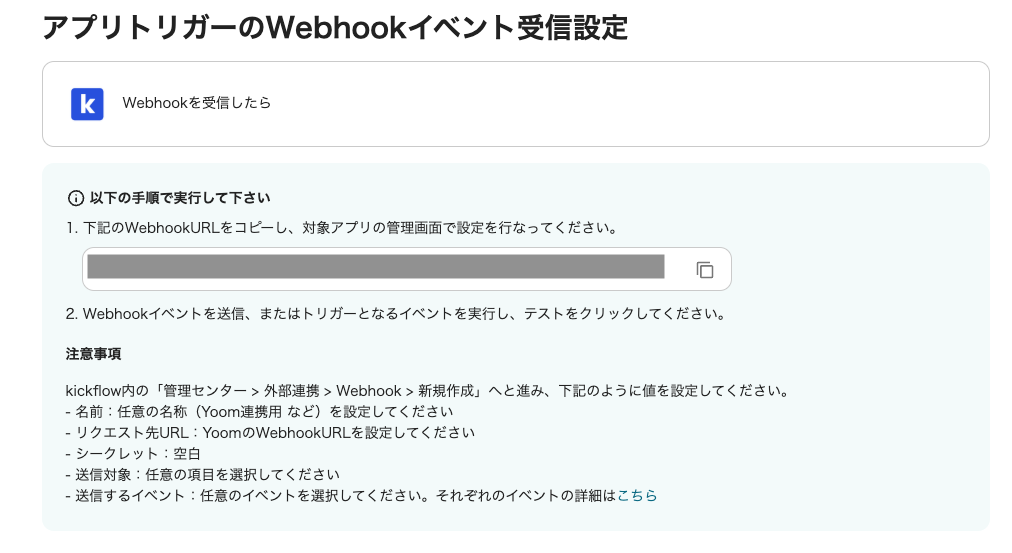 画面のWebhookURLをコピーし、注釈を参考にしながらkickflowにて設定を行いましょう。