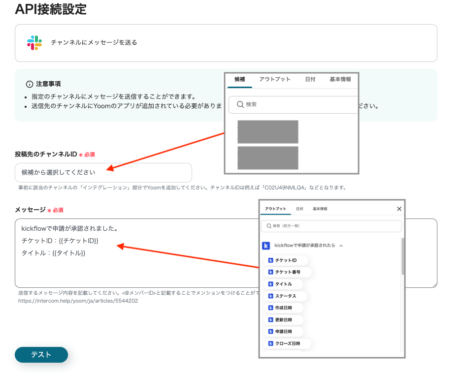 各項目の設定後「テスト」をクリックし、選択したチャンネルにメッセージが送信されるか確認しましょう。