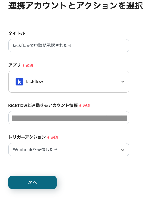 「タイトル」は任意で編集できます。一方で、「トリガーアクション」は変更せずに「次へ」をクリックしてください。