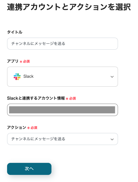 こちらは先ほどと同様にタイトルの任意編集とアカウントの確認を行い、アクションは変更せず「次へ」をクリックして先に進みます。